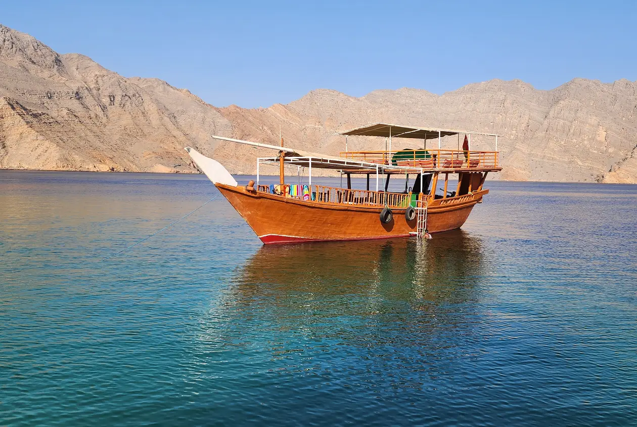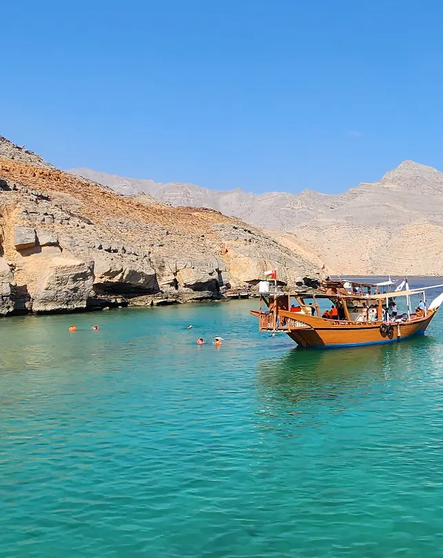 Sail the Musandam fjords, spot dolphins, snorkel in calm bays and enjoy a fresh Omani lunch onboard.